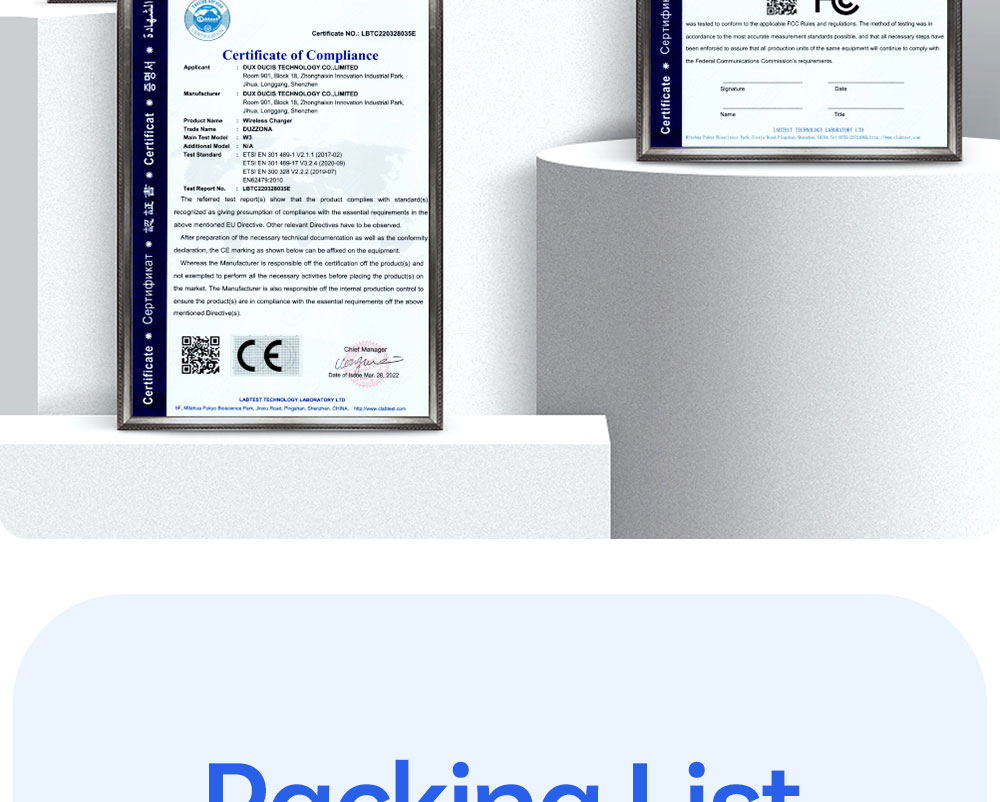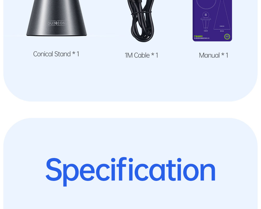 Packing List: 1*round wireless charger, 1*small car bracket, 1*conical bracket, 1*USB-C to USB-C cable (1M), 1*instruction manual. Recommended for use with 20W USB-C power adapter (sold separately).